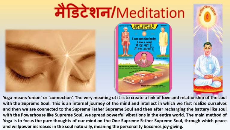 Raja Yoga is the combination of two words ‘Raja’ and ‘Yoga’. ‘Raja’ means King and ‘Yoga’ means union or connection. The very meaning of it is to become a king over our mind and senses by having the union, i.e., a loving relationship with the Divine. It enables us to see our highest potential and realize our eight essential powers of the soul to face the challenges with inner stability, confidence, and understanding. This study empowers us to stabilize in our true religion of soul consciousness and transcend the sensual pleasures and experience the ‘Super Sensuous Joy’ while performing all the actions.